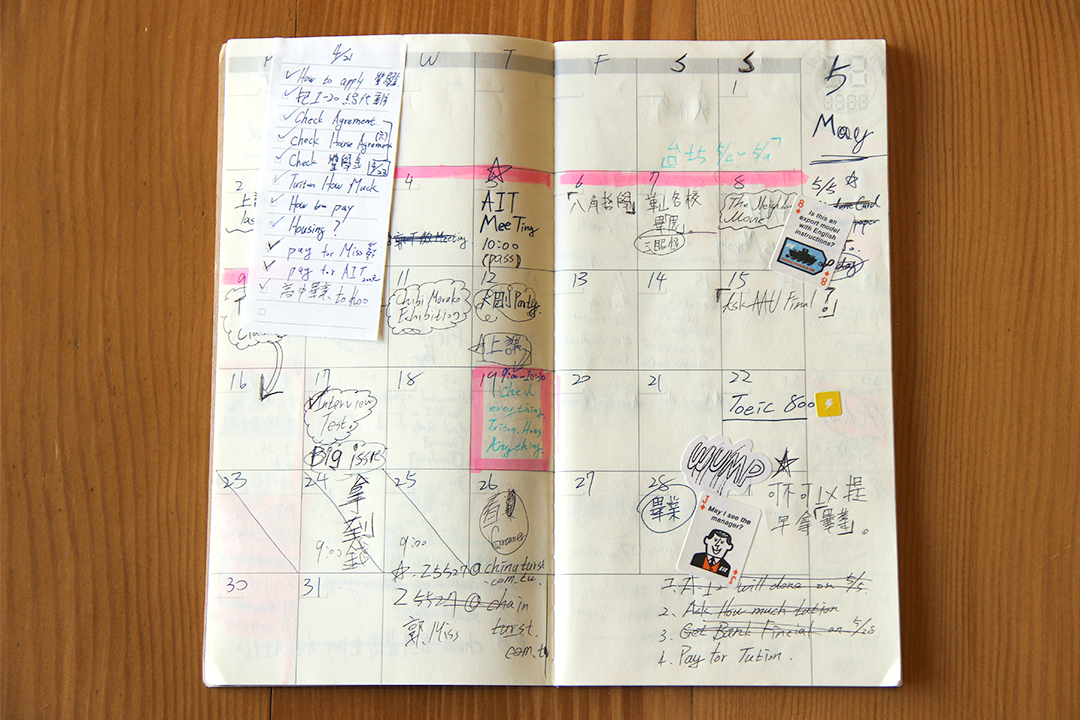Sam 的母親對於日本文化有非常深度的了解,她長期經營日式壽喜燒和日式雜貨用品店,並販賣日本的相關雜貨與文具。實際上,Sam 會接觸 TRAVELER’S NOTEBOOK 是來自他的母親推薦,他母親對於 TRAVELER’S NOTEBOOK 已經非常的了解。Sam 在高中畢業時,他問他的母親:“我上大學時想要一本新筆記本,你沒有沒推薦的品牌?” 當他的母親說出 “TRAVELER’S NOTEBOOK” 的那一刻,他立即在台南市發現了一家小店,出售 TRAVELER’S NOTEBOOK 的筆記本,當他看到這筆記本的那一刻,Sam 認為這本筆記本跟他的個人很符合,並買了棕色的筆記本。那時在2012年的春天,對於 TRAVELER’S NOTEBOOK 第一印象是,為什麼那麼貴? 但是,當他在商店時接觸到筆記本的皮革時,並被這種舒適感所吸引,“所以我不再擔心價格”。 Sam 繼續解釋說,他也非常喜歡可以自訂義的筆記本。”我不喜歡那種一次性用完就丟的感覺,我喜歡這筆記本只需要替換內頁,但是外皮還是保有一起成長的痕跡,跟我的生活理念很相同。”